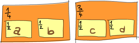 至于 >>= 呢?看起来有点复杂,所以我们换种方式来思考,我们知道 m >>= f 会等价于 join (fmap f m),所以我们来想要怎么把一串包含 probability list 的 list 弄平。举个例子,考虑一个 list,'a' 跟 'b' 恰出现其中一个的机率为 25%,两个出现的机率相等。而 'c' 跟 'd' 恰出现其中一个的机率为 75%,两个出现的机率也是相等。这边有一个图将情形画出来。